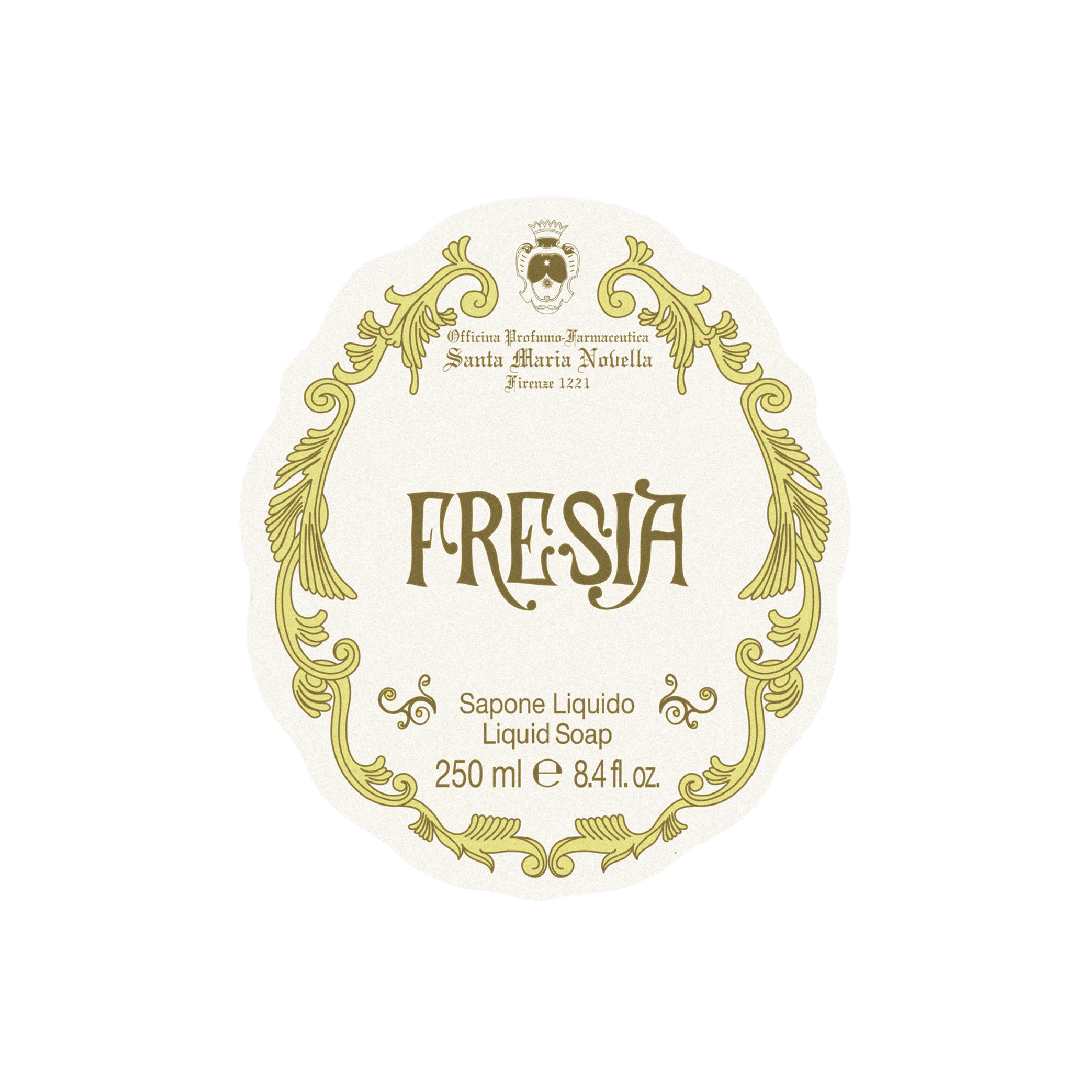 Fresia: the enveloping freshness aroma of Officina Profumo-Farmaceutica di Santa Maria Novella. The liquid soap is formulated with surfactants of vegetable origin and enriched with natural saponins. The formula is completed with calendula extract, chosen for its softening properties.